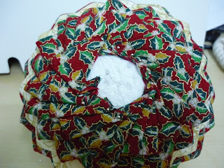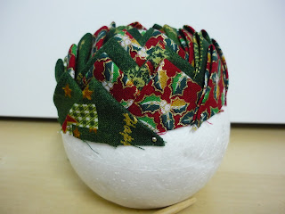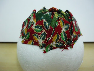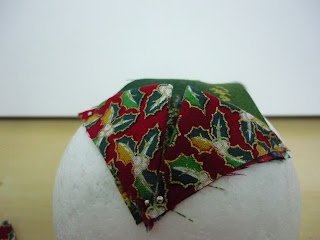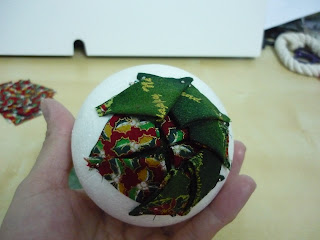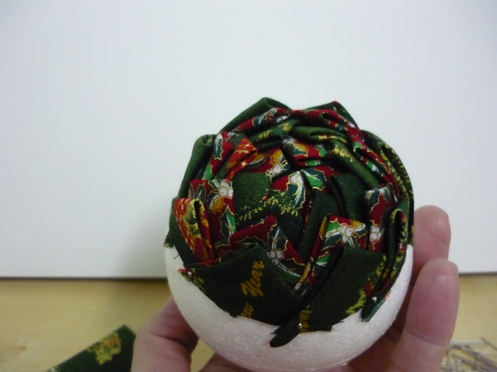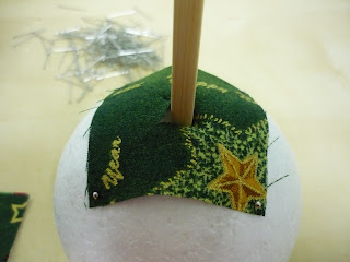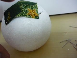 7º PASO: Empezaremos cubriendo el hueco de la bola de poliespan con el cuadro de tela con los piquetes y fijándolo con los alfileresDe esta manera si queréis poner la vela no hay problema